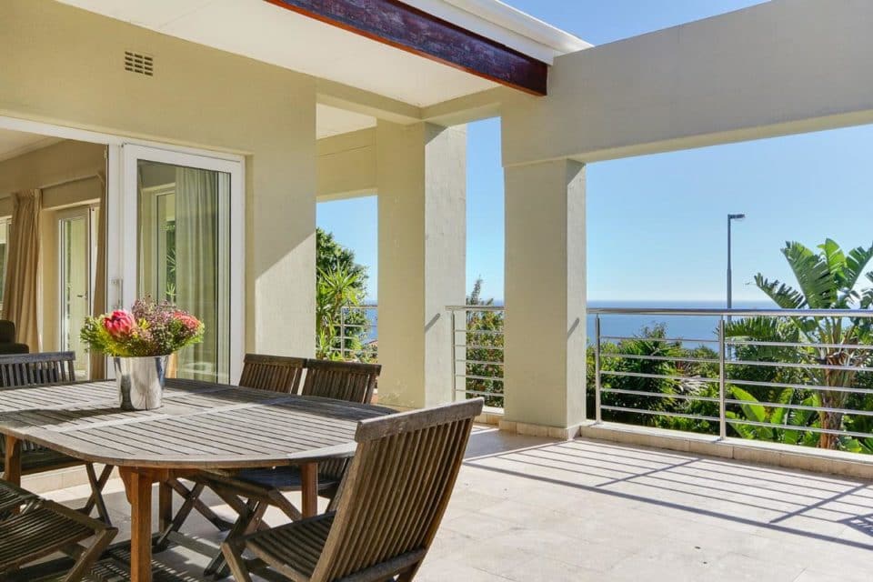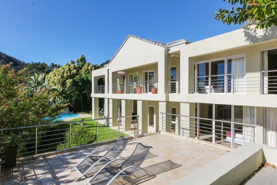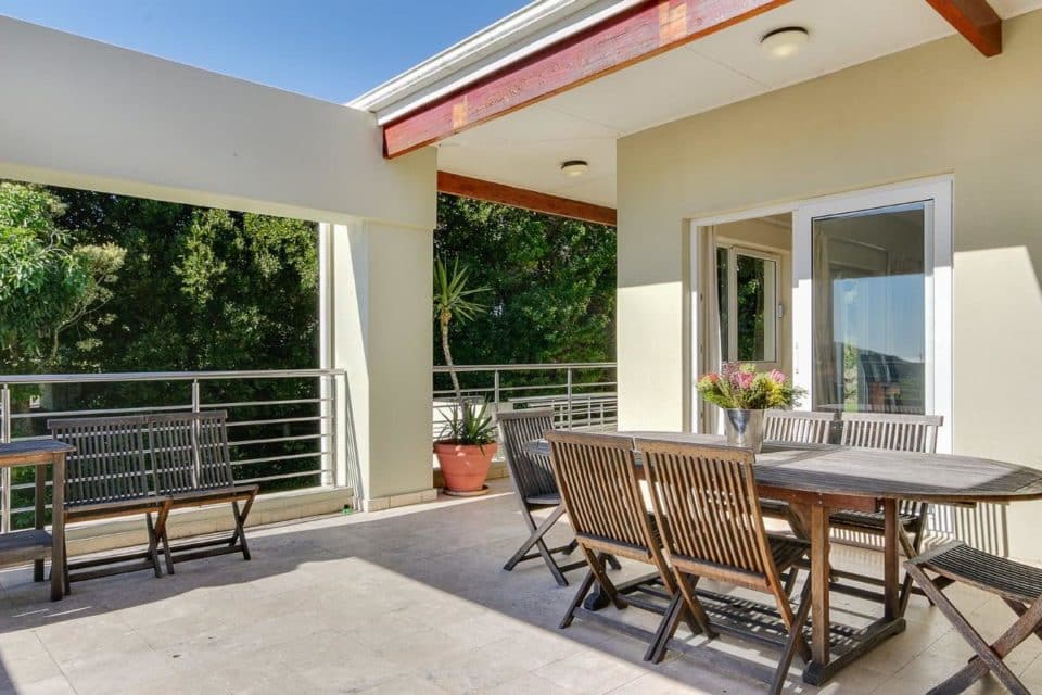 The upper level has a large wrap-around balcony looking down onto the garden and pool below.