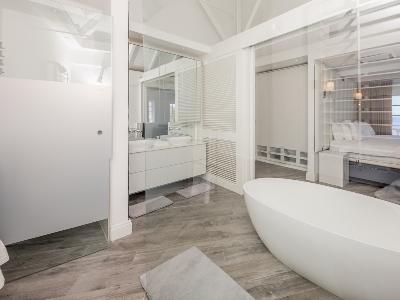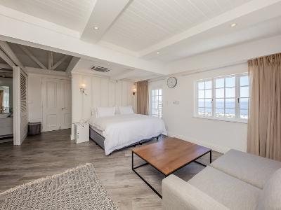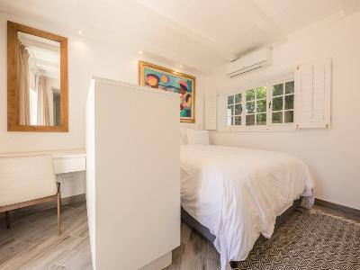 The living & dining areas and open plan kitchen area on the middle level of the house, which is also the entrance level. The living area leads onto a balcony with sea views, and the dining room leads onto a back courtyard with barbeque and outside seating – great for entertaining! The 5th en-suite bedroom is also on this level and leads onto the courtyard.